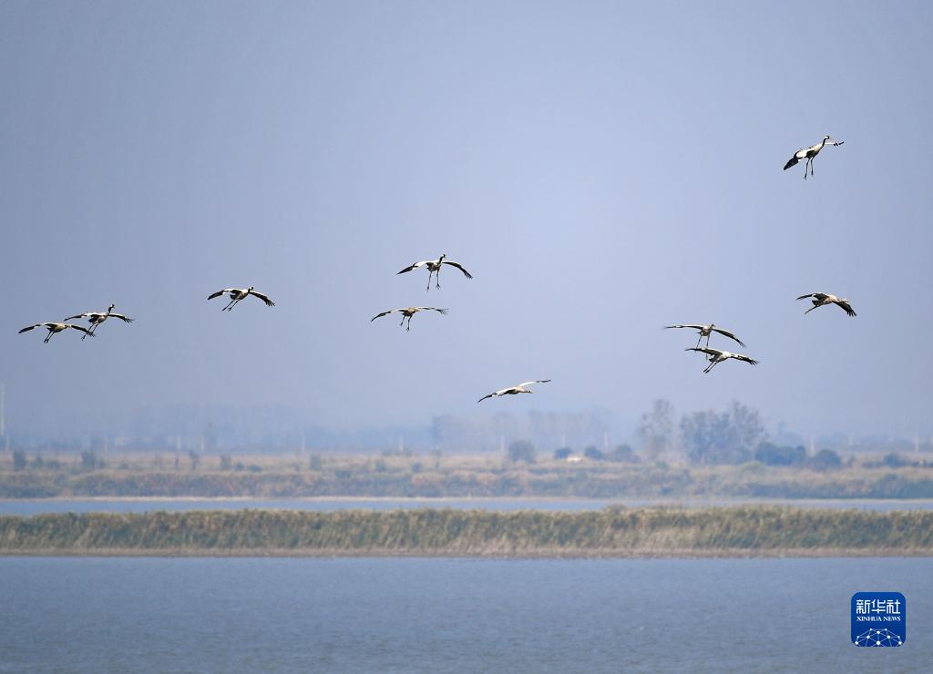 灰鶴展翅飛翔在沉湖濕地上空(11月6日攝)。