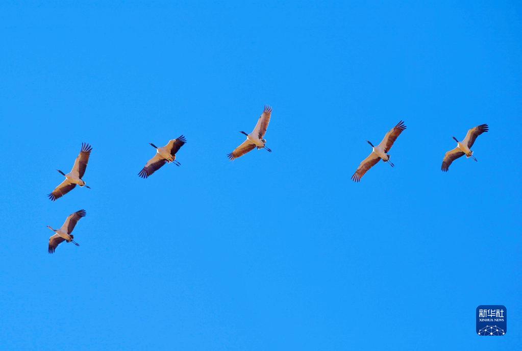 黑頸鶴在林周縣黑頸鶴自然保護(hù)區(qū)上空盤旋(11月6日攝)。