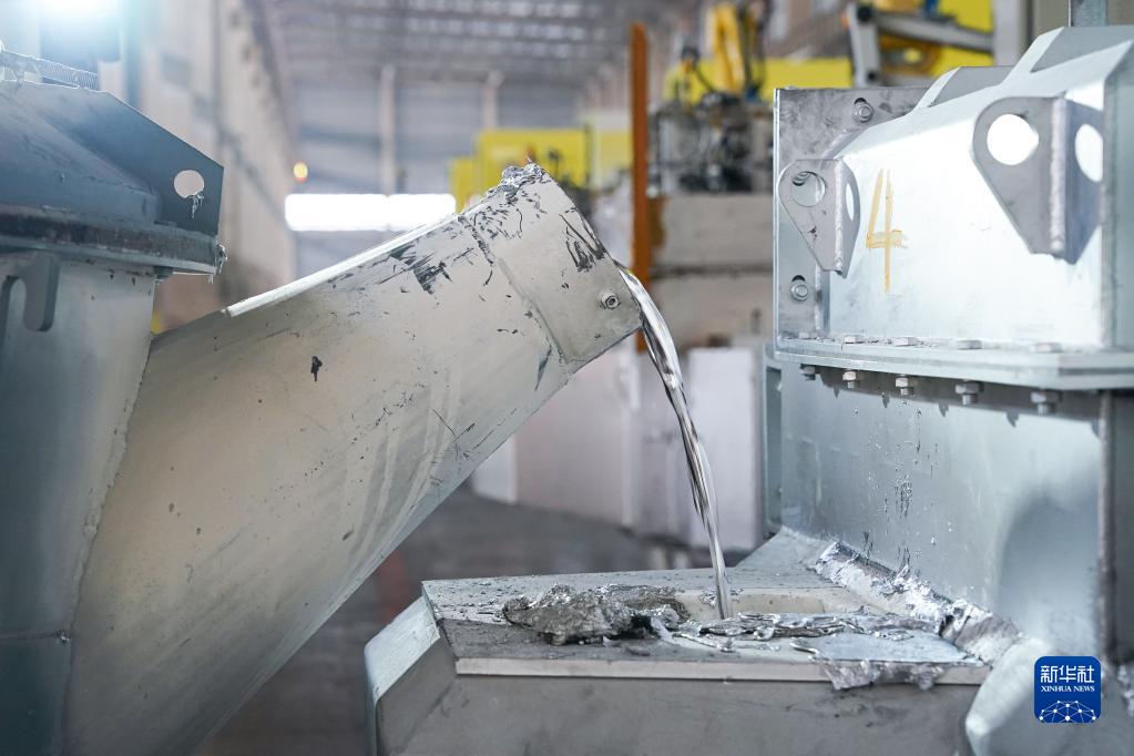 11月7日,在安徽省馬鞍山市含山縣三基輕合金成型科技有限公司,工人操作叉車向壓鑄機的燃氣保溫爐內添加鋁液。