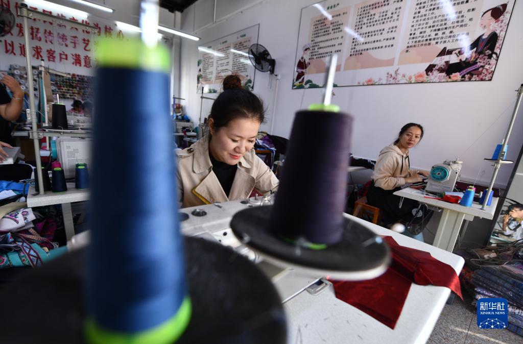 在廣西融水苗族自治縣一家苗繡生產基地,繡娘在制作刺繡產品(11月8日攝)。近年來,在粵桂協作的幫扶下,苗繡文化得到進一步挖掘、傳承和發展。