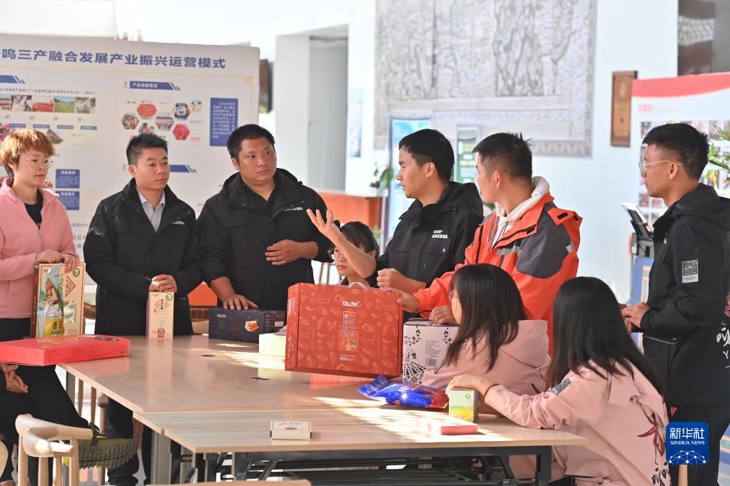 在廣西融水苗族自治縣農(nóng)產(chǎn)品電商中心,負(fù)責(zé)人吳紹林(右五)和同事探討業(yè)務(wù)(11月8日攝)。近年來,在粵桂協(xié)作的幫扶下,當(dāng)?shù)仉娚痰玫竭M(jìn)一步發(fā)展。