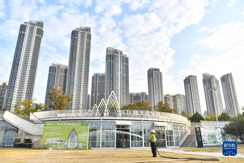 這是11月8日拍攝的武漢市青山江灘的草坪營地。