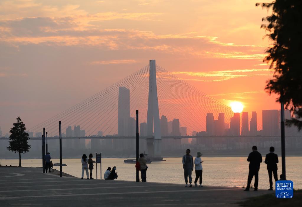 11月8日,市民在武漢市青山江灘邊欣賞落日。