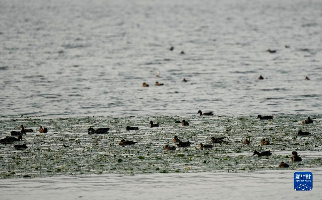11月7日,在重慶市梁平區雙桂湖國家濕地公園,成群候鳥在湖面嬉戲。