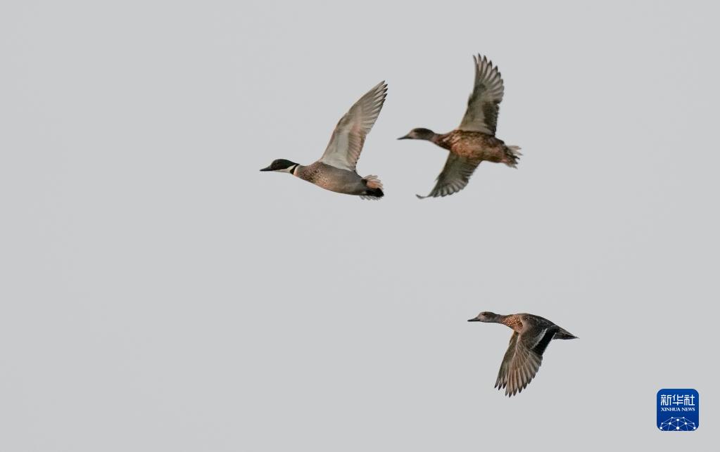 11月7日,在重慶市梁平區雙桂湖國家濕地公園,幾只羅紋鴨在空中飛翔。