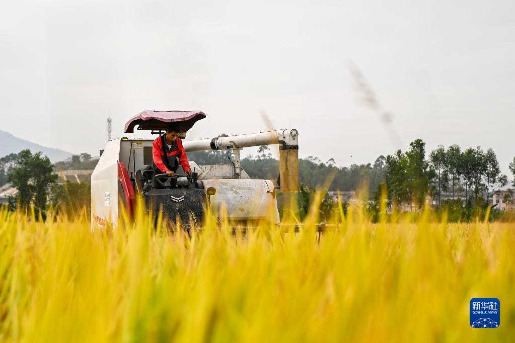 11月9日,在興業縣葵陽鎮葵聯村,農機手駕駛收割機收獲水稻。