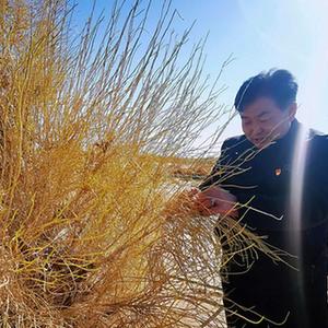 11月4日,內蒙古巴彥淖爾市烏拉特后旗巴音查干嘎查黨支部書記寶玉查看梭梭長勢。