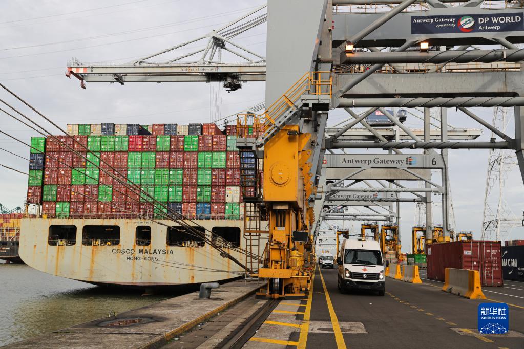10月27日,在比利時安特衛普,船舶停靠在比利時安特衛普-布魯日港的集裝箱碼頭。新華社記者 鄭煥松 攝
