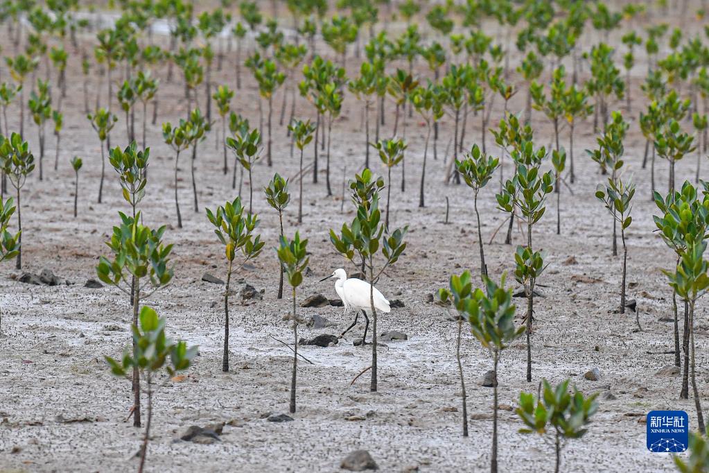 11月8日,鷺鳥在海南省儋州市新英鹽場濕地人工栽種的紅樹林間覓食。新華社記者 蒲曉旭 攝
