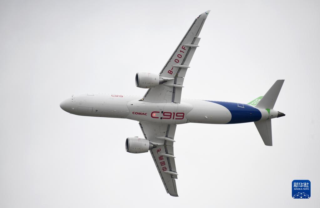 國產大飛機C919在第十四屆中國航展上進行飛行展示(11月8日攝)。新華社記者 盧漢欣 攝