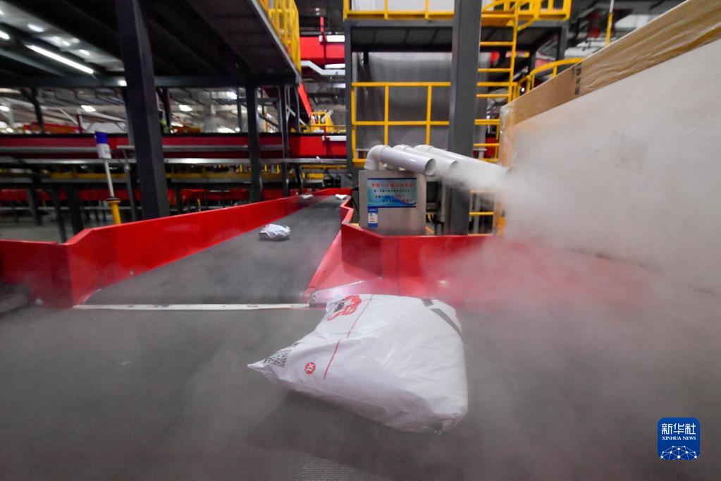 11月9日,在順豐速運天津全自動中轉樞紐,霧化消殺設備對快遞包裹進行消殺。