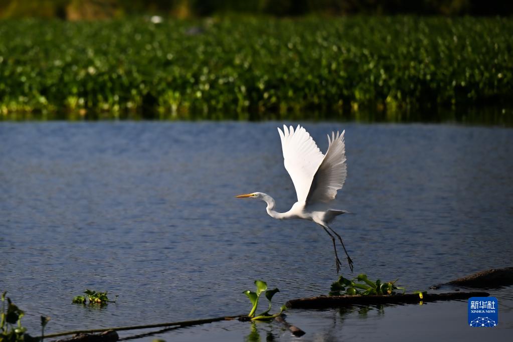 在墨西哥首都墨西哥城霍奇米爾科生態公園,一只白鷺展翅飛翔(2022年11月2日攝)。