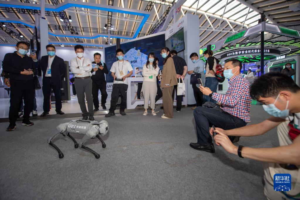 11月10日,觀眾在博覽會上參觀機器狗表演。