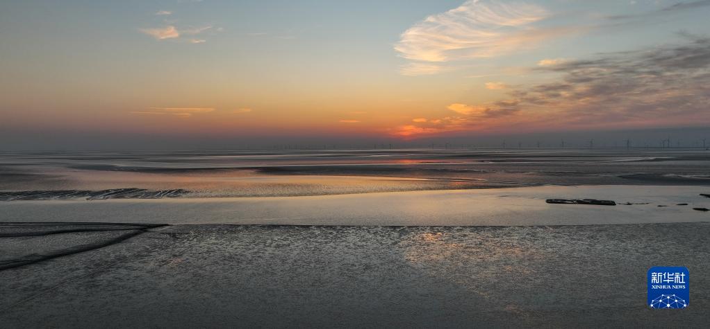 晨曦中的鹽城東臺條子泥濕地景色(11月9日攝,無人機照片)。