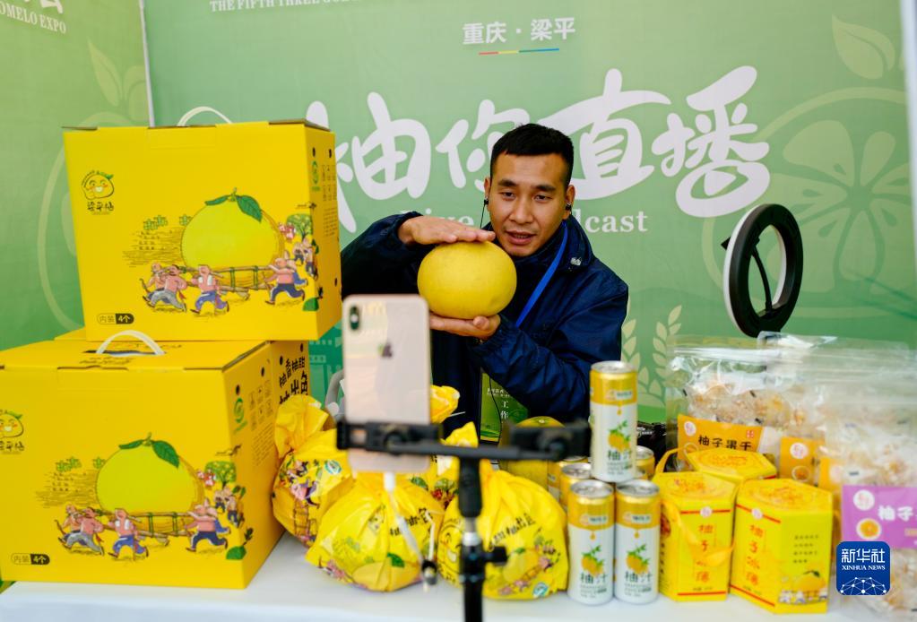 11月9日,在重慶市梁平區合興鎮龍灘村,工作人員在博覽會現場通過網絡平臺推介柚子產品。