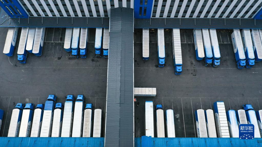這是11月10日在位于貴州省龍里縣的貴州快遞物流園拍攝的快遞車輛(無人機(jī)照片)。