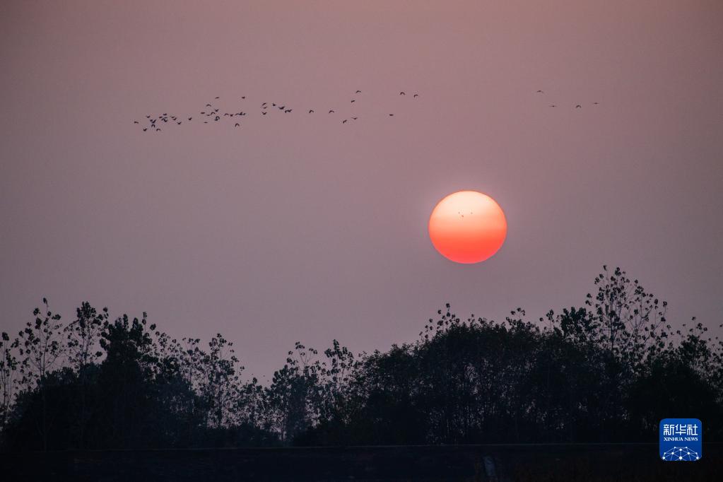 這是11月10日在湖南西洞庭湖濕地拍攝的夕陽和候鳥。