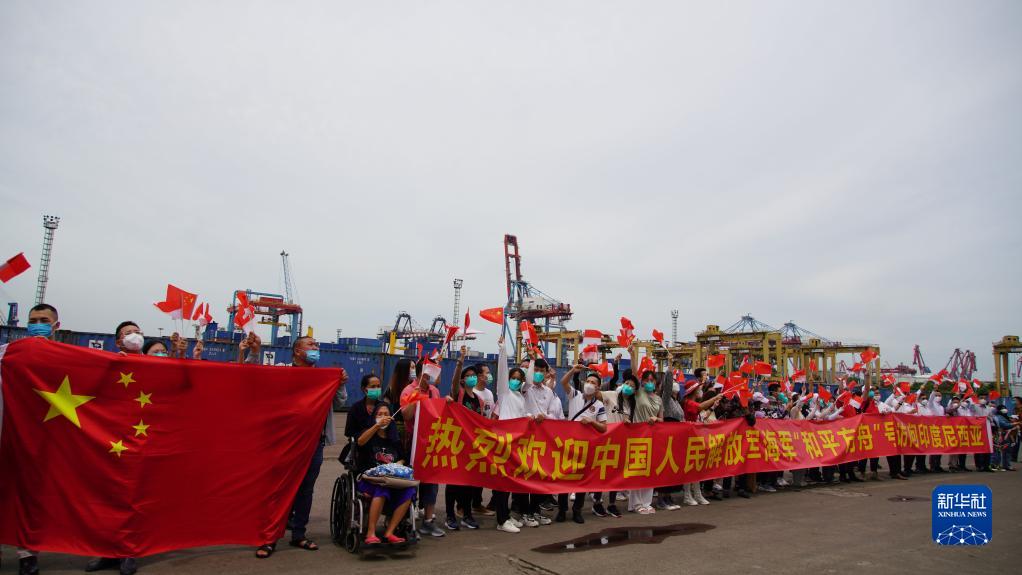 11月10日,在印度尼西亞首都雅加達,人們歡迎中國海軍“和平方舟”號醫(yī)院船。