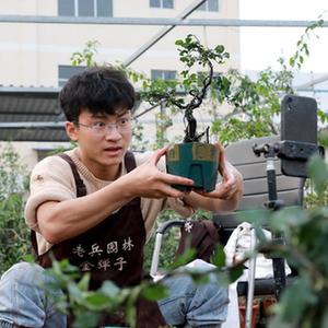11月10日,四川省華鎣市明月鎮(zhèn)一家園林的工作人員利用手機(jī)直播銷(xiāo)售盆景。