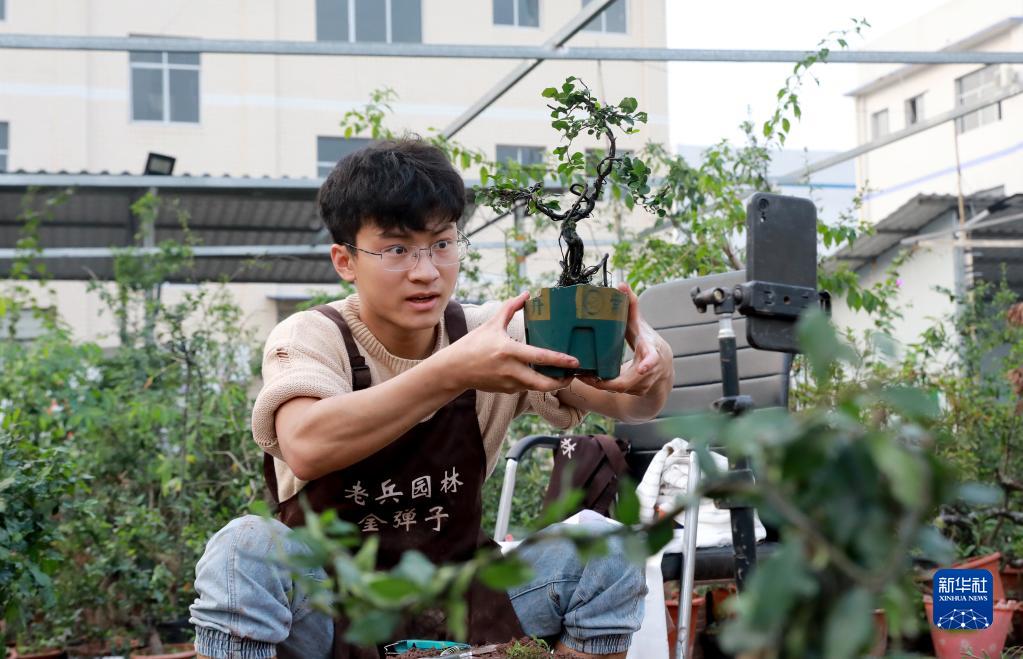 11月10日,四川省華鎣市明月鎮(zhèn)一家園林的工作人員利用手機直播銷售盆景。