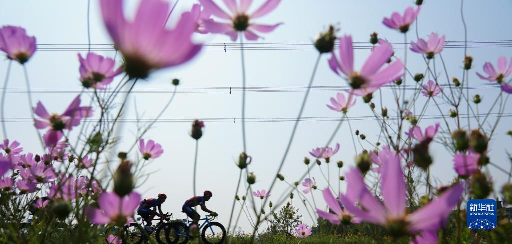 環鄱陽湖國際自行車賽在南昌市高新區鄱陽湖畔舉行,自行車選手在騎行中(2019年9月28日攝)。