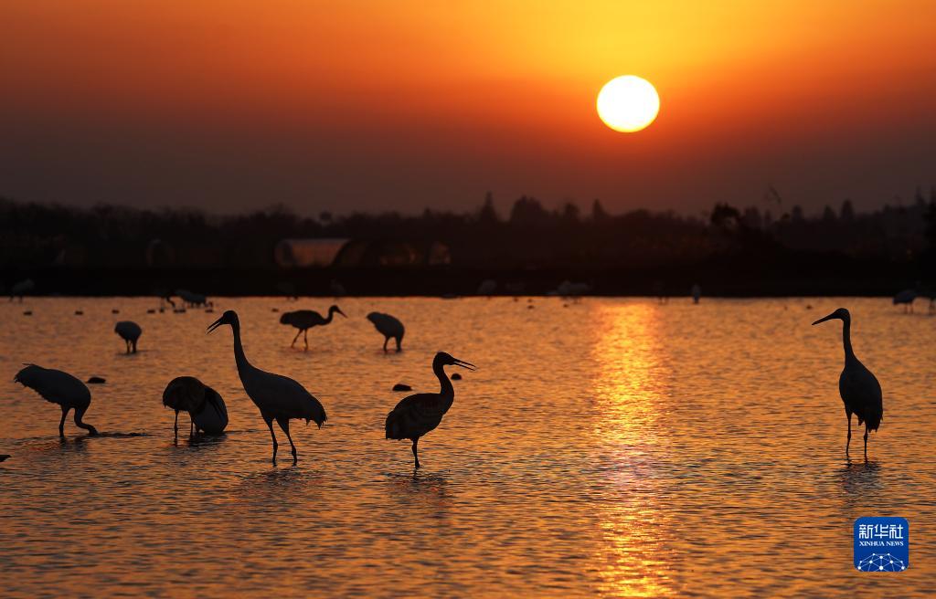 在南昌市高新區五星白鶴保護小區,白鶴等候鳥在濕地里棲息(2021年12月21日攝)。