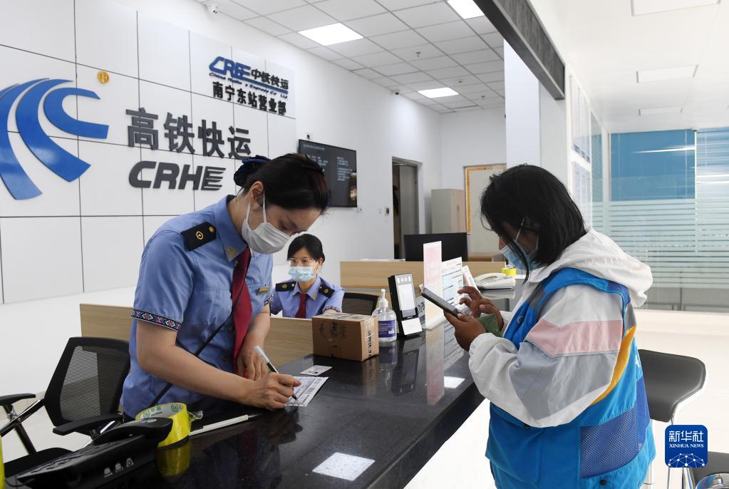 11月11日,在中鐵快運南寧東站營業(yè)部,工作人員(左)在辦理快運業(yè)務(wù)。