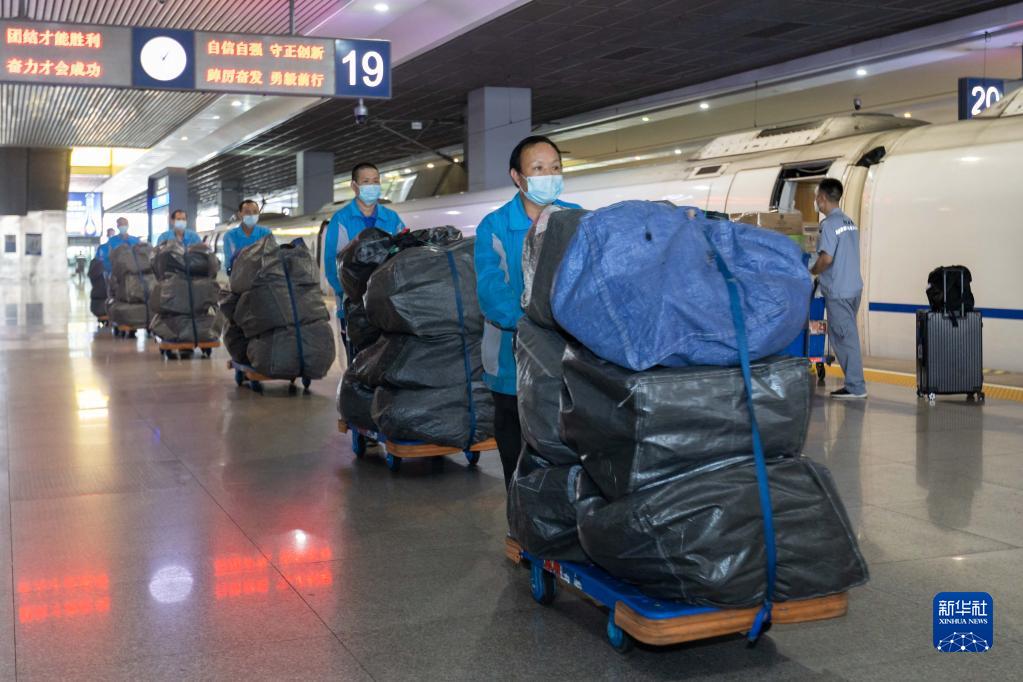 11月11日,在上海虹橋站,工作人員將打包好的貨物運送到集散點。為應對 “雙11”物流高峰,中國鐵路上海局集團公司將部分載客高鐵動車組列車用于快件運輸。
