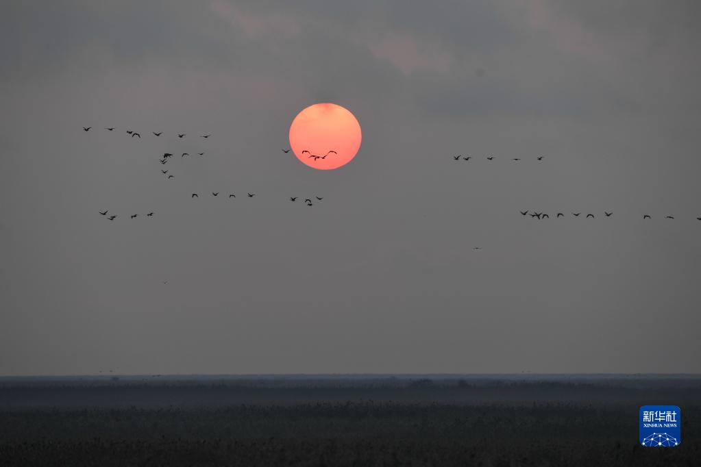 初冬清晨,紅彤彤的朝陽從黃海邊徐徐升起,籠罩在輕紗般薄霧中的濕地醒來了。成群的丹頂鶴、灰鶴、東方白鸛等排成各自獨特的隊形,在美麗的家園自由飛翔。