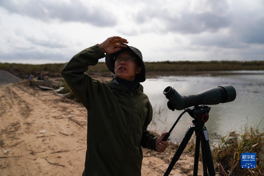 保護區科研人員趙永強在開展鳥類多樣性調查和監測(11月8日攝)。