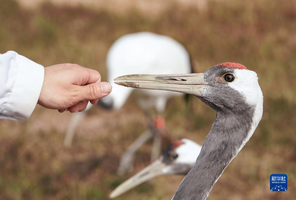 保護區馴養員與人工繁育的丹頂鶴互動(11月8日攝)。