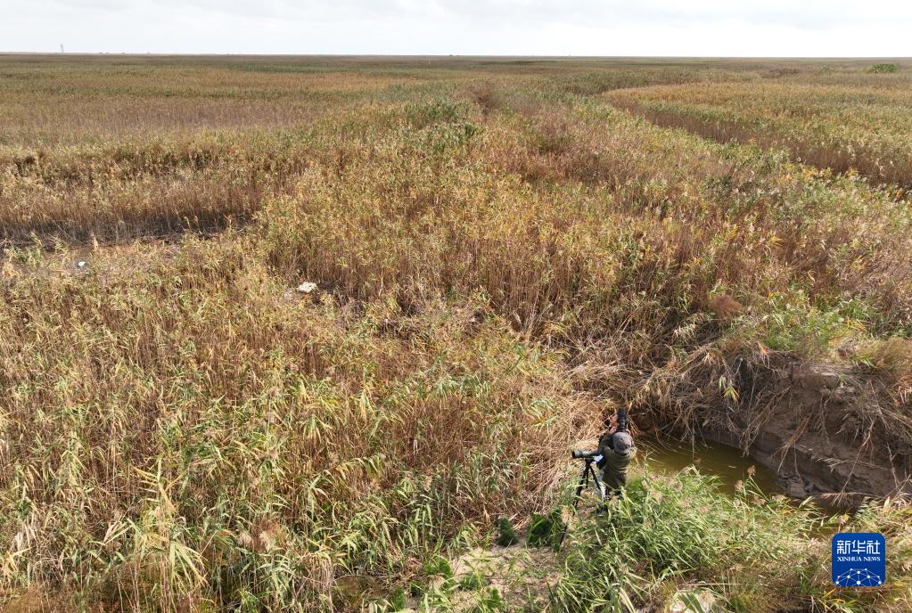 保護(hù)區(qū)科研人員李征浩和趙永強(qiáng)(下)在開展鳥類多樣性調(diào)查和監(jiān)測(11月8日攝,無人機(jī)照片)。
