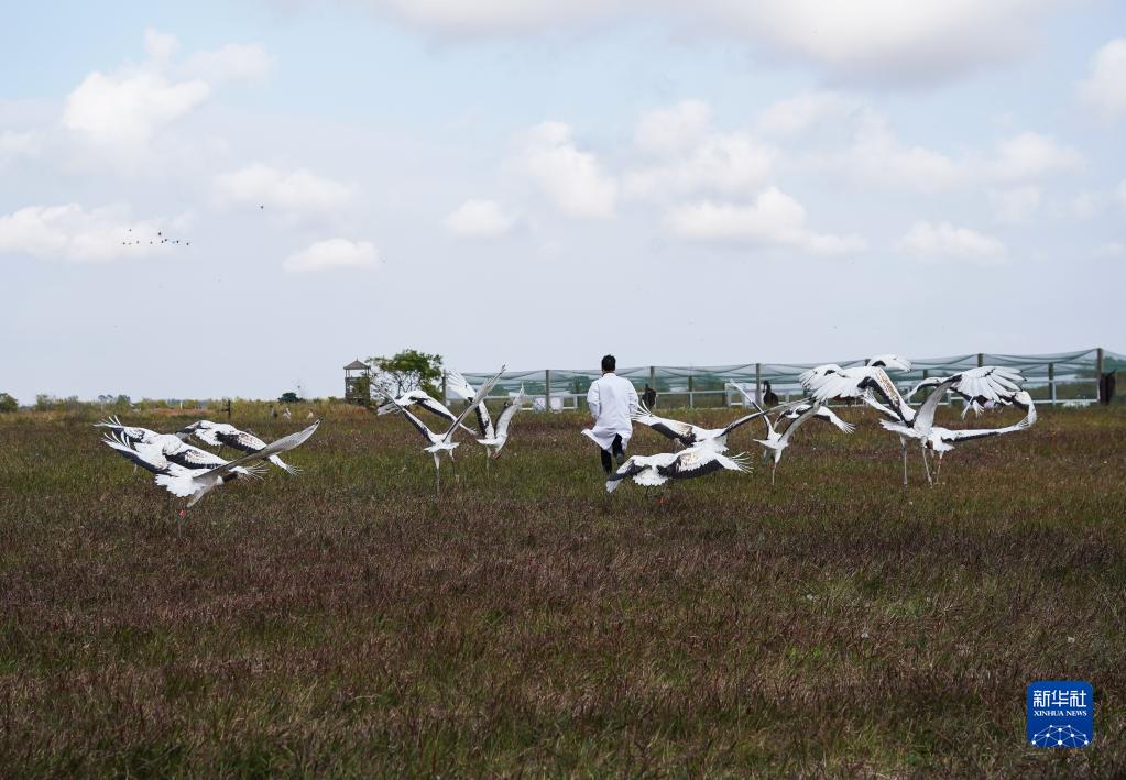 保護(hù)區(qū)馴養(yǎng)員姜官宏對人工繁育的丹頂鶴進(jìn)行野化放飛訓(xùn)練(11月8日攝)。