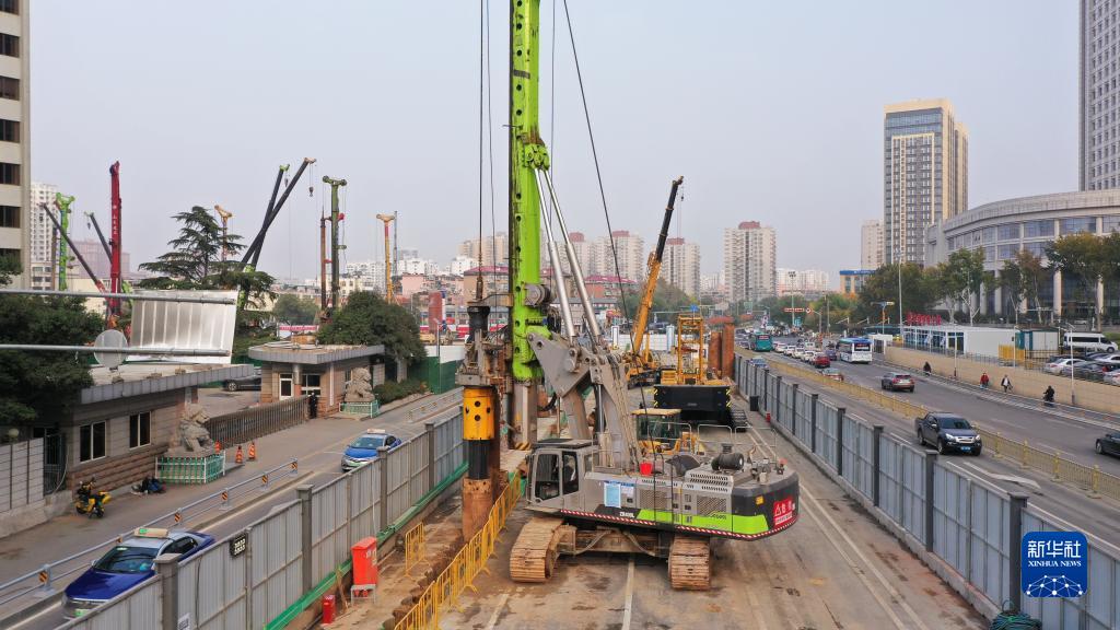 11月11日,在濟南地鐵6號線濟南站,中鐵十局工作人員在進行主體圍護結構首樁開鉆作業(無人機照片)。