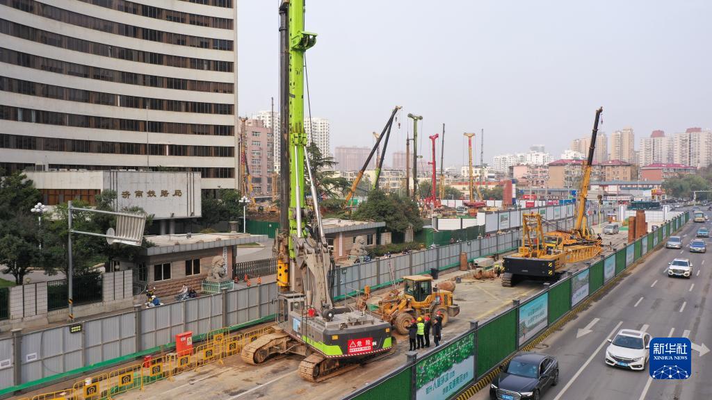 11月11日,在濟南地鐵6號線濟南站,中鐵十局工作人員在進行主體圍護結構首樁開鉆作業(無人機照片)。
