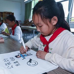 11月11日,嘉興市省身教育集團光明小學美術社團學生在環保袋上繪制宣傳畫。