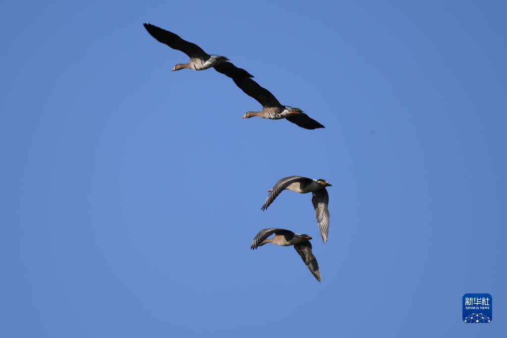 11月10日,幾只候鳥在安徽升金湖國家級自然保護區上空飛翔。