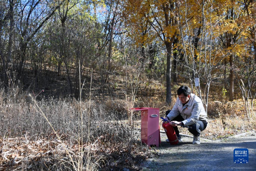 在翠湖國(guó)家城市濕地公園,張庚檢查園中的消防設(shè)備(11月7日攝)。