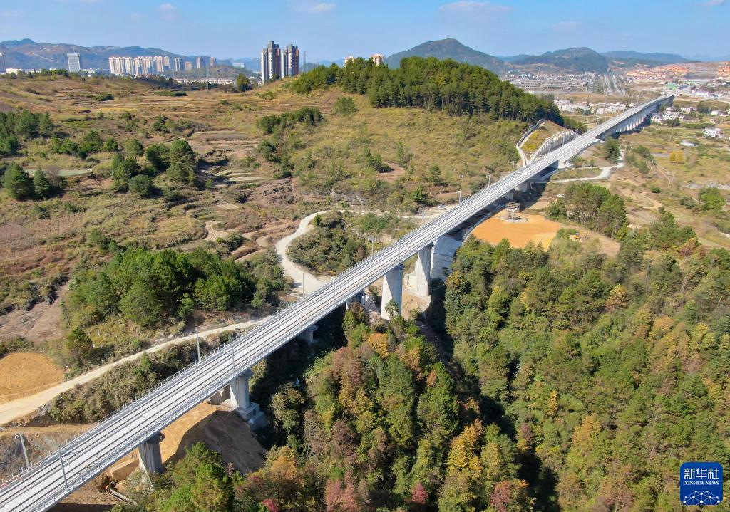 11月11日拍攝的完成鋪軌的貴南高鐵貴州獨山縣部分路段(無人機照片)。