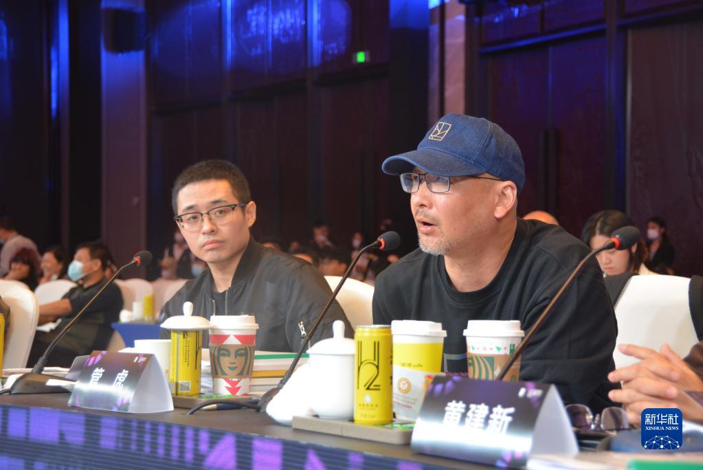 11月10日,導(dǎo)演管虎(右)在金雞電影創(chuàng)投大會現(xiàn)場與青年電影人交流。