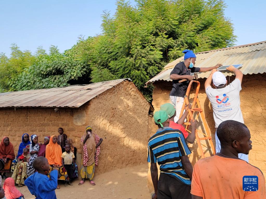 11月4日,在尼日利亞卡諾州邦庫雷區勞特耶村,技術人員安裝調試太陽能家用照明設備。
