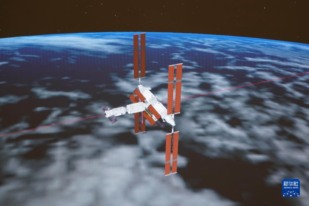 11月12日,在北京航天飛行控制中心拍攝的天舟五號貨運飛船與空間站組合體完成自主快速交會對接示意圖。