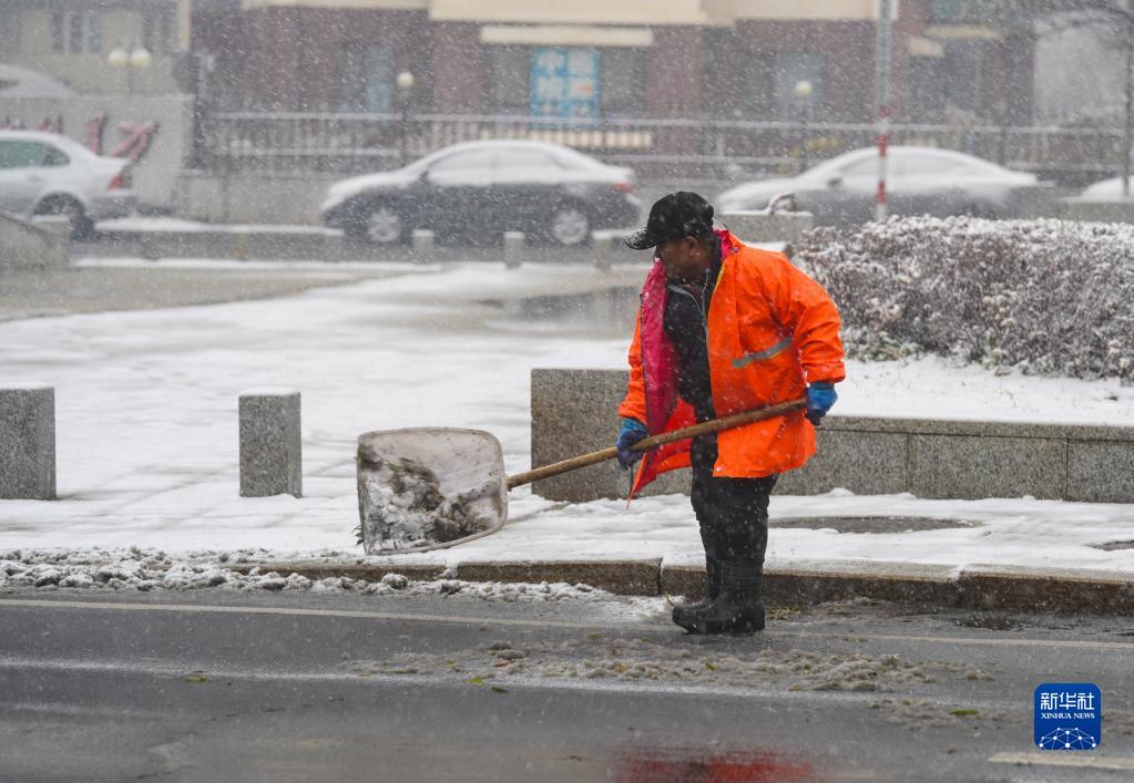 11月12日,在吉林省吉林市,環衛工人在清理馬路積雪。