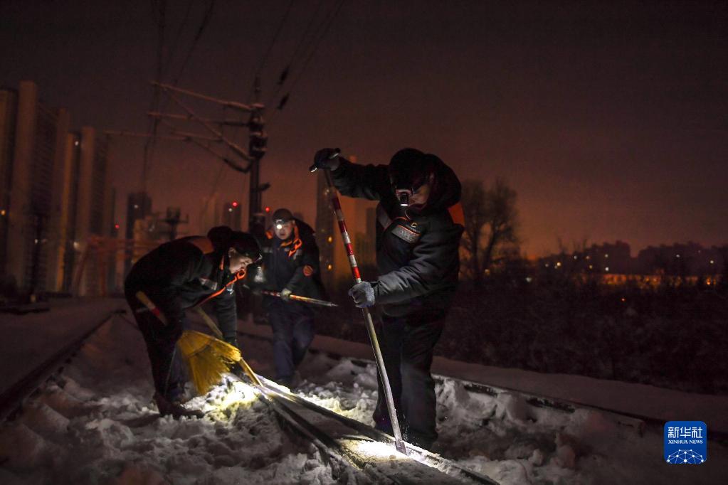 11月13日,在長春火車站,中國鐵路沈陽局集團有限公司長春高鐵基礎(chǔ)設(shè)施段工作人員清理鐵軌縫隙內(nèi)的冰雪。