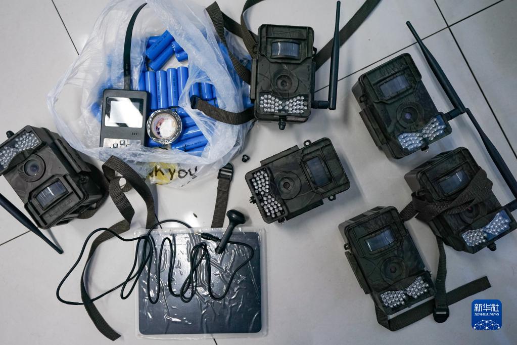 這是用于野生動物監(jiān)測的紅外相機、電池、太陽能板等設備(11月8日攝)。
