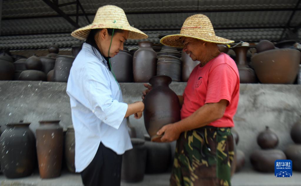 在欽州市欽北區貴臺鎮貴臺龍窯,利遠遠(左)與工人商討坭興陶廢品的處理問題(11月13日攝)。
