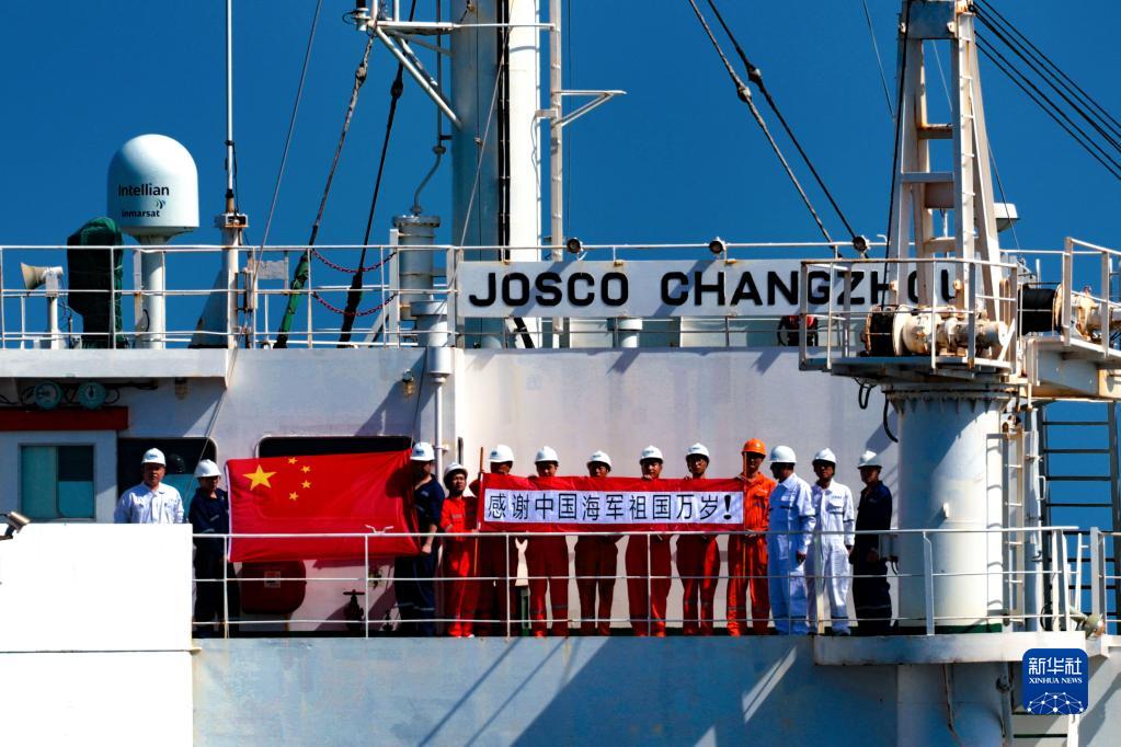 被護(hù)船舶向中國海軍第41批護(hù)航編隊(duì)展示國旗和寫有“感謝中國海軍祖國萬歲”字樣的橫幅(8月5日攝)。
