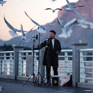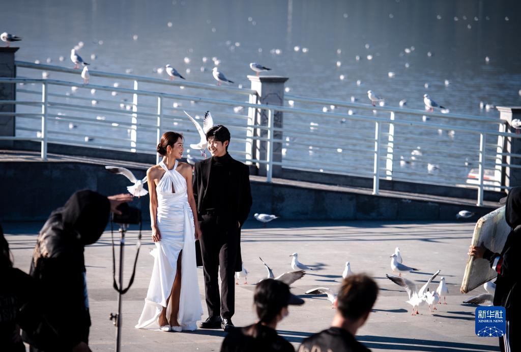 11月17日,市民在海埂大壩以紅嘴鷗為背景拍攝照片。