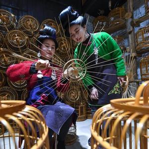 在貴州省丹寨縣龍泉鎮(zhèn)卡拉村的鳥籠文創(chuàng)工坊,苗族手工藝人在編制鳥籠(11月16日攝)。