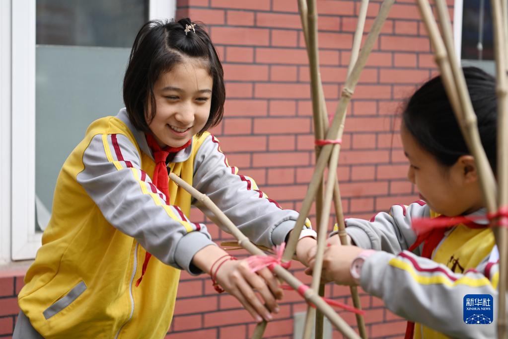 11月17日,天津市和平區中心小學的學生在搭設竹架。